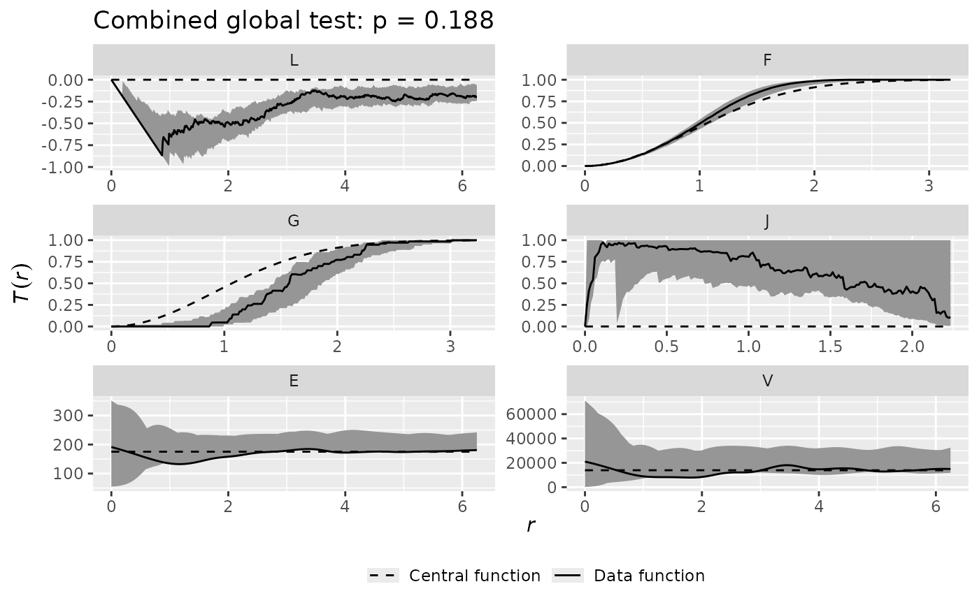 and the GET package for the global envelope tests. The L, F, G, J, E, and V functions are a collection of